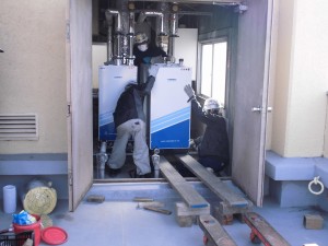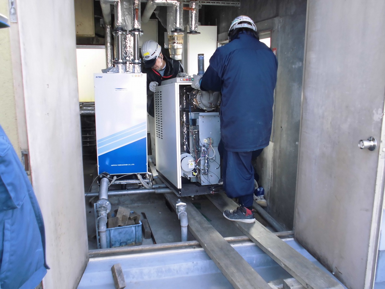 保守契約先であるビジネスホテル様のボイラー(給湯用)×2台の交換作業を実施致しました。お客様の職制上、年中無休24時間営業をされている関係、営業をされながらの交換作業でした。2台のボイラーを1台づつ復旧をする工事の為、スピードと慎重さが求められる「かなりの難工事」でしたが、無事作業は終了致しました。テクノオカダでは、ボイラーの保守・工事も対応可能です!ボイラーに関するお問い合わせご相談は、当社までご連絡ください。
